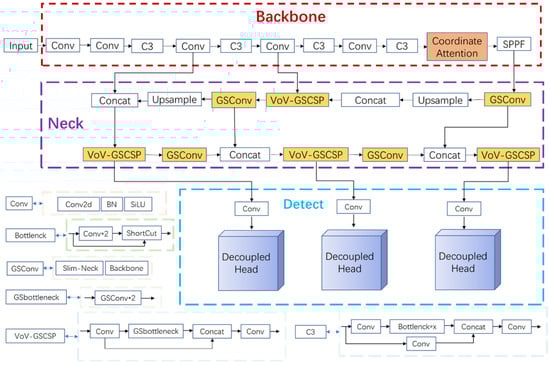 The model of this method consists of Input, Backbone, Neck, and Detect. The Backbone layer mainly performs feature extraction, which extracts the object information from the image through the convolutional network for later target detection. The Neck layer blends and combines the features to enhance the robustness of the network and strengthen the object detection ability and passes these features to the Head layer for prediction. To improve training speed, YOLOv5s version 6.0 replaces the Focus module with a convolution operation of size 6 × 6, step size 2, and padding 2. The Bottleneck module is based on the residual structure of ResNet, which can effectively reduce the training time. The C3 module contains three standard convolutional layers and multiple Bottleneck modules. This way, remote dependencies can be captured along one spatial direction, while accurate location information can be preserved along the other spatial direction. The generated feature maps are then encoded as a pair of orientation-aware and position-sensitive attention maps, respectively, which can be applied complementarily to the input feature maps to enhance the representation of objects of interest. Version 6.0 of YOLOv5s uses the SPPF module instead of the SPP (Spatial Pyramid Pooling) module. The SPPF module uses multiple small-sized pooling kernels in cascade instead of a single large-sized pooling kernel in the SPP module. GSConv and Slim-Neck methods are introduced in Neck layer. On the one hand, it replaces the Conv module with the lightweight convolution method GSConv, and on the other hand, it replaces the previous C3 module with the VOV-GSCSP module, which consists of the GSbottleneck module and Conv module, which are set up by GSConv. Finally, the three higher resolution features from the fused features are input to the decoupling head to complete the task of identifying the target class (classification problem), determining the target location (regression problem) and the confidence level. The improved network model and structure are shown in Figure 5.