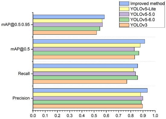 Firstly, the experimental data using the same dataset for YOLOv3, YOLOv5-6.0, YOLOv5-5.0, YOLOv5-Lite, and the model trained based on the improved method were compared, see data in Table 7.