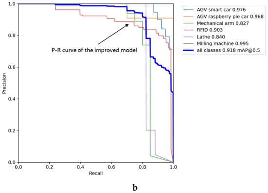 Table 7 shows that when the model trained using the improved method is tested, the precision rate reaches 93.6%, the recall rate reaches 85.6%, mAP@0.5 reaches 91.8%, and mAP@0.5:0.95 reaches 58.5%. The precision rate improved by 5.5% compared to YOLOv5-Lite, the recall rate improved by 8.8% compared to YOLOv3, mAP@0.5 improved by 8.9% compared to YOLOv5-5.0, and mAP@0.5:0.95 improved by 6.4% compared to YOLOv3. The size of the weight of the model trained by the improved method is only 23% of the YOLOv3 model. Figure 9 compares the performance parameters of the iterative process of YOLOv3, YOLOv5-6.0, YOLOv5-5.0, YOLOv5-Lite, and the improved method. It can be seen that the improved method achieved a substantially higher precision rate as well as higher recall rate and other indicators. A comparison of the P–R curve of the improved model with the original YOLOv5-6.0 model is shown in Figure 10. Figure 10a represents the P–R curve of the original model of YOLOv5-6.0, and Figure 10b represents the P–R curve of the improved model. In Figure 10 we can see that the improved model outperforms the original model of YOLOv5-6.0 in terms of mAP@0.5.