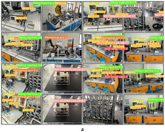 YOLOv3, YOLOv5-6.0, YOLOv5-5.0, YOLOv5-Lite, and the improved method using productionlineData homemade dataset test results show that the improved method is overall better than YOLOv3, YOLOv5-6.0, YOLOv5-5.0, and YOLOv5-Lite The trained results and the weights obtained by the improved method take up less memory and are more convenient for use with development boards in the industry. Figure 11a,b show representative images taken during the training process. In Figure 11a, it can be seen that the confidence of the improved method is close to 1 for all the devices in the production line recognition. Figure 11b shows that in the improved production line, all equipment have been recognized correctly under the tiny recognition target and complex environment, and the target detection envelope can tightly surround the recognition target.