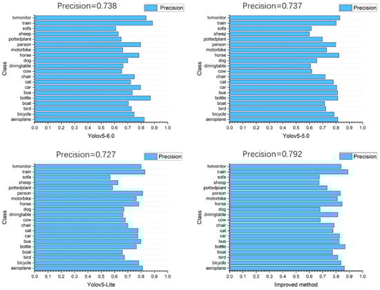 In this paper, we used Pascal VOC2007 public dataset to compare the experimental data of the models trained by YOLOv5-6.0, YOLOv5-5.0, YOLOv5-Lite, and the improved method, and the results are shown in Table 8. For Pascal VOC2007 public dataset trained using the improved method, the precision rate reaches 79.2%, the recall rate reaches 59.5%, mAP@0.5 reaches 66.8%, and mAP@0.5:0.95 reaches 44.1%. Compared with YOLOv5-Lite, the precision rate improved by 6.5%, and compared with YOLOv5-5.0, mAP@0.5 improved by 1.5%. Figure 12 shows the precision rates of the model weights for YOLOv5-6.0, YOLOv5-5.0, YOLOv5-Lite, and the improved method.