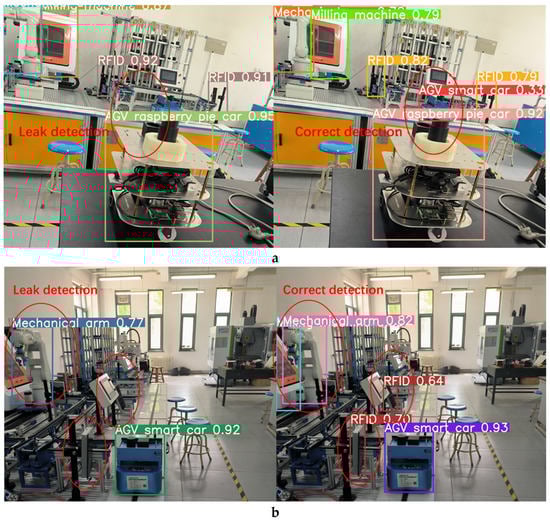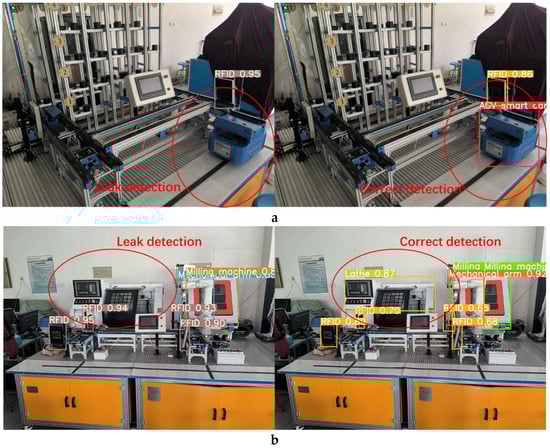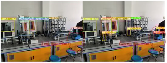 In order to verify the performance of the production line equipment identification and localization method based on the improved YOLOv5s model, we introduced weights trained by YOLOv3, YOLOv5-6.0, YOLOv5-5.0, YOLOv5-Lite, and the improved method into identification tests, and the comparison of the test results are shown in Figure 13, Figure 14, Figure 15 and Figure 16. In Figure 13a, it can be seen that the YOLOv5-5.0 model incorrectly identifies the black shadow part in the lower left corner as RFID, and there is a false detection. In Figure 13b, the YOLOv5-Lite model weights do not identify the lathe, and there is a missed detection. In contrast, the improved method identifies all parts correctly without missing detection. Figure 14a shows that the YOLOv5-6.0 model weights do not identify the AGV smart car. In Figure 14b, the YOLOv5-6.0 model weights do not identify the lathes, and there is a leakage situation. In contrast, the improved method identifies all parts correctly without leakage. A reliable 3D coordinate positions of the equipment is also obtained through the conversion from pixel coordinate system to camera coordinate system. The model weights of YOLOv3 and YOLOv5-Lite in Figure 15 and Figure 16a do not identify the AGV smart car. The model weights of YOLOv5-Lite in Figure 16b do not identify the milling machines and RFID. In contrast, the improved method identifies all correctly without missing detection. For all cases, the center coordinates of all equipment can be accurately transmitted back to the console by the improved method, showing its more reliable performance.