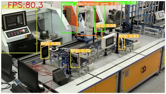 When using sensors and RFID to monitor production line equipment, firstly, a large number of sensors need to be arranged, and secondly, data integration is required during the inspection process, and it is difficult to achieve real-time detection. Traditional manual monitoring of production line equipment is inefficient, inaccurate, and fails to ensure staff safety. The working environment using the improved method can intelligently identify the production line equipment based on the location and category information provided by the monitoring system, expanding the flexibility of the manufacturing process. It greatly reduces the cost of manpower and equipment, effectively avoids the subjectivity and individual differences in the manual inspection process, and provides higher inspection efficiency and accuracy. Experiments show that the FPS (Frames Per Second) of the improved method can reach 80.3, meeting the requirements of real-time inspection, as shown in Figure 17.