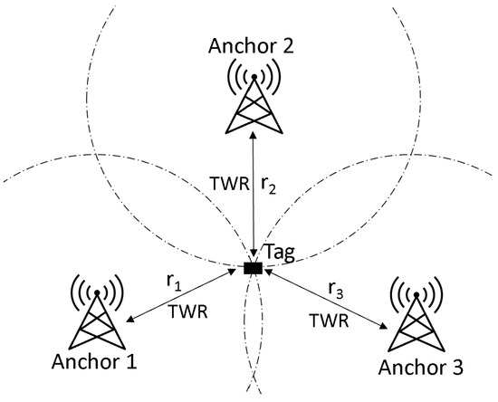 6]. The system consists of at least three transmitters (anchors), which are positioned at previously measured points, and a receiver (tag), which can be located in real time within the range of the transmitters. For localization in three-dimensional space, several steps are necessary, which can vary slightly depending on the specific measurement methods used by a manufacturer and are shown schematically in