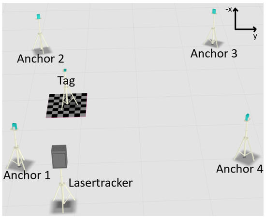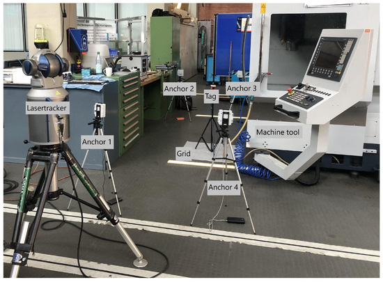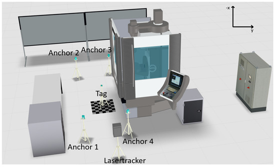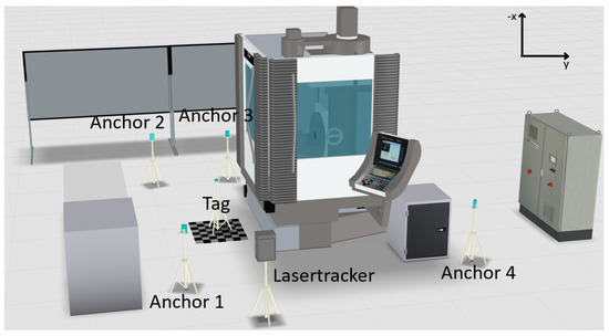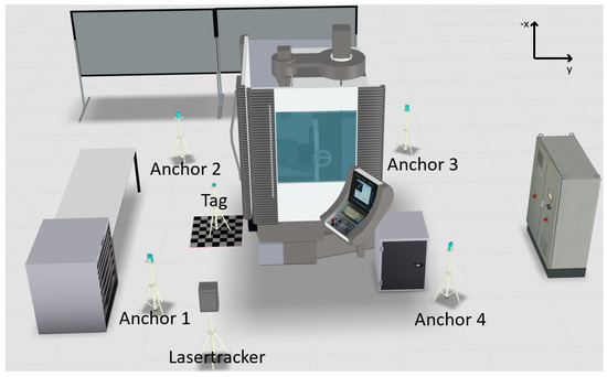 Figure 7, the last anchor module (anchor 4) without visual contact is brought into line of sight of the receiver. The other anchor positions are not changed. Consequently, there are no other objects in the direct measuring range of the UWB system. Due to the short distances to the machine tool and other objects, further interference with the radio frequencies is possible (see