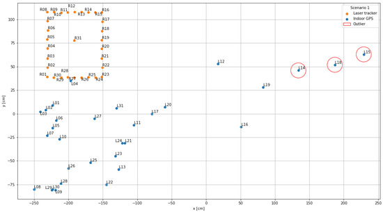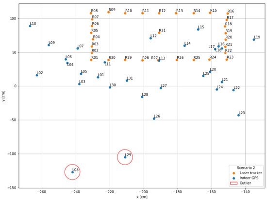 The visualization performed in the first step serves as a general overview of the measurement data and is used to compare the scenarios with each other. For this purpose, the recorded x- and y-coordinates of the indoor positioning system (blue points; name “Lxx”) as well as those of the laser tracker (orange points; name “Rxx”) were displayed in a mutual coordinate system.