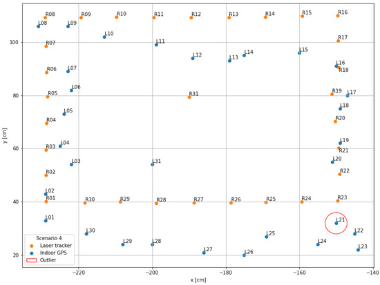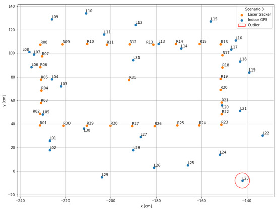 Figure 11, the measurement point distribution of the indoor positioning system data could again be significantly improved in reference to the laser tracker data. Comparable outliers as in scenarios 1 and 2 no longer exist. The point L23 (y-deviation: 43.53 cm) has the largest deviation, and the indoor positioning system points result in a similar rectangular structure as the reference data. The mean errors are 5.37 cm in the x-direction, 15.99 cm in the y-direction, and 17.78 cm in total. The standard deviations are 3.97 cm, 12.82 cm, and 12.02 cm for the x- and y-direction and in total. The confidence interval in this scenario is 12.02 cm ± 4.43 cm with a probability of 95% for the confidence interval and 2.16 cm for the uncertainty