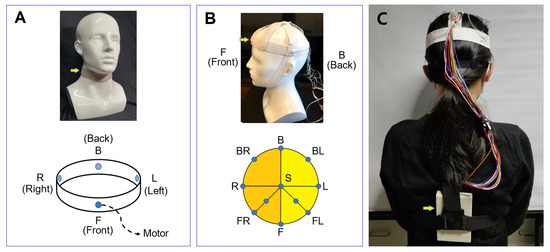 Schematic diagrams of the homemade tactile communication devices tested in this work. (A) A brown, ring-like neck device (highlighted by an arrow) was mounted on a gray 1:1 plastic head model. The neck device was embedded with four vibration motor actuators at the front, left, rear and right side of the user’s neck, which were denoted as F, L, B and R respectively. (B) A white head device mounted on a 1:1 white plastic head model. This head device was embedded with 11 vibration motor actuators located at the blue dot regions shown in the figure. For instance, the one mounted on the front position of the forehead was labeled as “F”. (C) A photograph of a tester wearing the 11-motor head device. The power circuit and wireless communication package were mounted on her back.