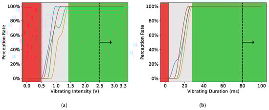 The mean intensity threshold among all subjects was (≈0.90 , ). The mean duration threshold was (). As the results show in Figure 2, the uncertain range in terms of vibration intensity is 0.49∼1.43 ; the uncertain range in terms of duration is 3.6∼27.7 . Therefore, if the vibration intensity is greater than and the vibration time is greater than , the subject’s perception can be guaranteed. This will be used as a reference for parameter setting in subsequent experiments.