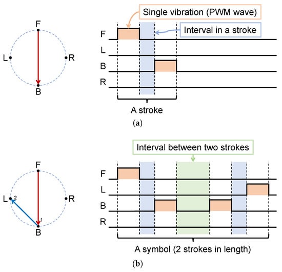 The pattern of motor vibration sequence we used and the corresponding pattern, taking the neck ring as an example. (a) Vectorized perception of a pair of stimuli FB and corresponding motor vibration timing diagram. (b) Vectorized perception of a complete set of stimuli FBBL and corresponding motor vibration timing diagrams.