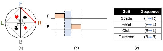 Poker stereoscopic perceptual suit coding, taking spades suit coding FR as an example. (a) The neck ring consists of four quadrants with pairwise motors and their corresponding patterns. (b) Motor timing diagram corresponding to spades code. (c) The poker suit code corresponding to the neck ring.