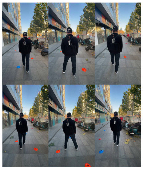 The experiment is shown in Figure 9. The researchers can clearly determine the position of the participant through the video and quickly send corresponding commands, such as forward, stop, left turn and so on. The participant successfully avoided pedestrians, parked vehicles, trees, steps, and obstacles on the road. Experiments showed that the blind participant was able to accurately accept tactile instructions and walk according to the instructions in some relatively simple road conditions.