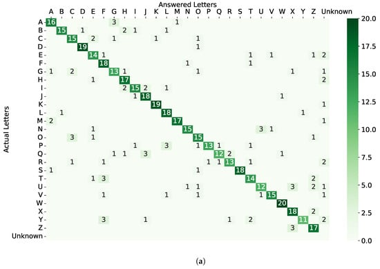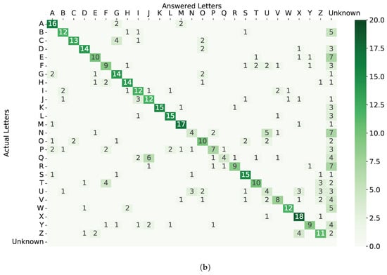The confusion matrices with and without movement illusion are shown in Figure 10. For the case without movement illusion, letters of “Y”, “Q”, “U”, “G”, “P”, and “R” had relatively low accuracy. The overall mean accuracy in the case without movement illusion was , and that in the case with movement illusion was . Using a Kolmogorov–Smirnov test, we found that normality for letter accuracy failed in both cases (), so we used Mann–Whitney U Test to compare the two sets of data. We found there was a significant statistical difference between the accuracy of two cases ().