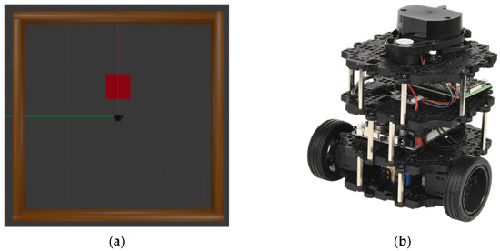 (a) Turtlebot3 in the simulation environment. The red square box is the destination, the red line is the x-axis, and the green line is the y-axis. and (b) a real TurtleBot3.