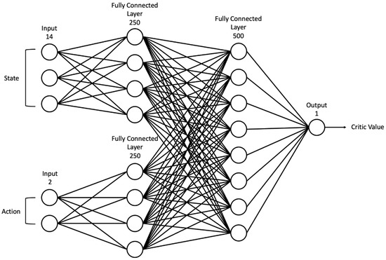 In our study, artificial neural networks were used to approximate actors to select actions for a given state and critique given states and actions. For learning stability, target networks were additionally used for both neural networks. As illustrated in Figure 3, an actor neural network was constructed based on a multilayer perceptron (MLP) architecture with noise. All layers of the actor network were composed of a fully connected layer, and the input layer consisted of 14 nodes and received the current state as the input. The hidden layer consisted of 500 nodes with noise at all weights and used a rectified linear unit (ReLU) activation function. The output layer consisted of two nodes, and both nodes denoted a deterministic action composed of and using sigmoid and hyperbolic tangent activation functions, respectively. As depicted in Figure 4, the critic network also consisted of an MLP structure and fully connected layer without noise. To evaluate the given state and action pair, the input layer had 14 nodes for the current state and two nodes for the action , which is the result of the actor network. In the first hidden layer, the nodes representing the state and action were connected to 250 nodes each, and all nodes were fully connected to each other in the second hidden layer. The output layer consisted of one node and was designed to provide critique values without an activation function. The actor network was optimized by maximizing the sum of the critique values using gradient descent as the loss function, which is defined as follows: