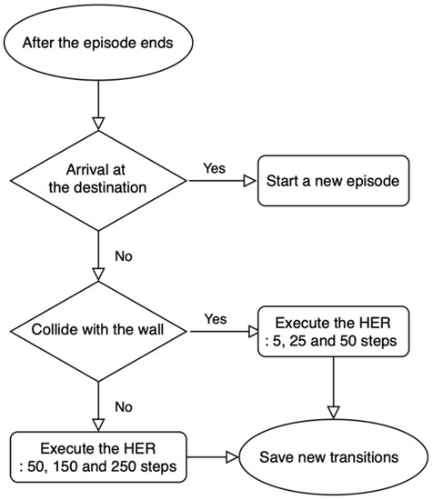 Figure 5 illustrates the overall process of generating new data transitions using the HER technique. Note that the data transition used for training is generated when the agent proceeds in one step and is stored in the buffer memory at every step. In general, data transitions are created by exploring random actions until a certain number of data transitions accumulate in the buffer memory. Based on these random actions, the probability of arriving at the destination in a continuous space is low. If the reward function is simple, this converts into a sparse reward problem. In an environment with sparse rewards, the agent cannot be guaranteed to converge to the optimized policy, and the agent may require a long time to learn to converge to the optimized policy. To solve this problem, previous studies have designed more complex reward functions, for instance, by using the distance between the mobile robot and destination as an argument in the reward function. By contrast, we used the HER technique to rapidly collect data transitions that help reinforcement learning, even if the reward function is simple. Algorithm 1 presents the overall process of generating new data transitions using the HER technique. First, when an episode fails, new data transitions are created based on this failed episode. As depicted in Figure 6, when the robot does not reach the destination, three random states are selected within this trajectory as new destinations, and the new trajectories from the beginning of the episode to the new destinations are created and then appended to the buffer memory. For example, Figure 6a presents a failure episode that does not achieve the goal within the maximum number of steps. In Figure 6b–d, the new destinations are selected at 250, 150, and 50 steps before the terminal state, and the data transitions are created from the beginning of the episode to the new destination. Figure 6e presents an episode that ended when the robot collided with a wall. As illustrated in Figure 6f–h, if the robot collides after 50 steps, the new destinations are selected at 50, 25, and 5 steps before the terminal state, and the new data transitions are created and stacked in the buffer memory. Through this process, the HER technique creates the possibility of convergence in situations wherein convergence cannot be achieved owing to the lack of normal experience, and it can simultaneously play a role in creating the possibility of faster convergence.