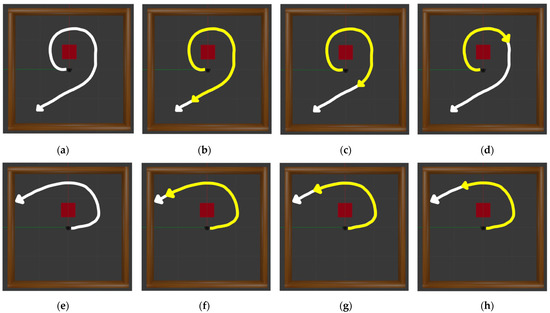 White lines are the trajectories of failed episodes and yellow lines are the sub trajectories generated from these white lines. (a) Case of the maximum-step trajectory, and the (b–d) trajectory generated according to each step of 50, 150, and 250. (e) Case of the collision trajectory, and the (f–h) trajectory generated according to each step of 5, 25, and 50. While the previous reinforcement learning algorithms without HER stores only (a,e) in the replay buffer, the proposed method appends (b–d,f–h) as well as (a,e), to the replay buffer.