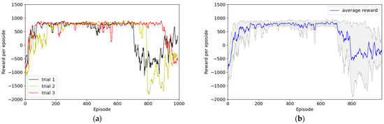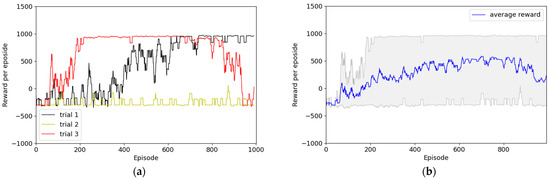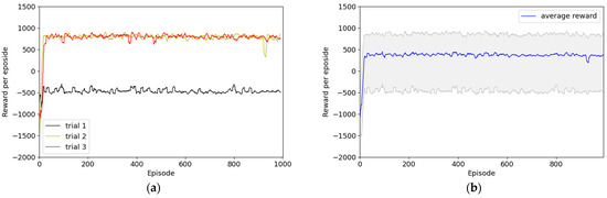 Second, Experiment 2 consisted of an environment wherein reward engineering was sufficiently applied, and Figure 10 illustrates the reward graph of the results without the HER technique. In one of the three experiments, the reward for most episodes was approximately −500, which indicates that no optimal policy was determined. However, the other two experiments demonstrated convergence to approximately +800 points in approximately 20 episodes, and this may indicate the establishment of a policy to successfully perform path planning to the destination. Figure 11 presents the results obtained with the application of the HER technique. Although the convergence speed differed across all three trials, the convergence was approximately +1000 points within 200 episodes. However, the first trial presented significantly lower reward results for 700 episodes, the second trial for 800 episodes, and the third trial for 900 episodes.