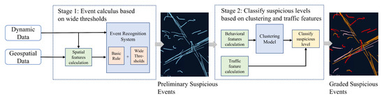 The main goal of this method is to identify suspected illegal transshipments comprehensively and accurately by taking into account the behavior characteristics difference between sea areas and similarity with ships sailing in highly trafficked waters. To achieve this goal, a hierarchical identification framework is proposed. As shown in Figure 1, there are two main stages in this method. In the first stage, the system performs event inference based on basic rules and wide thresholds. In the second stage, the system classifies suspicion levels based on clustering results and the traffic density feature.