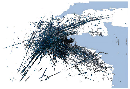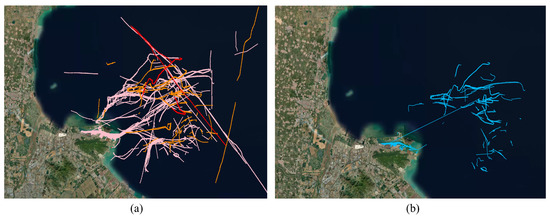At the same time, the fixed thresholds methods identified 312 events in the same area, their trajectories are shown in Figure 13b. It can be seen that the recognition result partially overlaps with the traffic flow area and generates a lot of false recognition in the inland river area.
