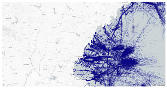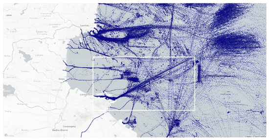 To test the ability of the proposed method to discriminate misidentified behavior within traffic flows, the sea area with obvious traffic flow characteristics in this dataset, as shown in the area inside the white border of Figure 12, was selected, with a latitude range of [34.68–34.96] degree and a longitude range of [119.36–120.00] degree from 1 June 2019, to 10 June 2019.