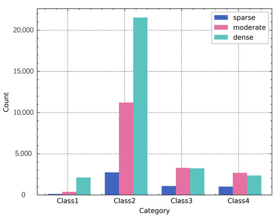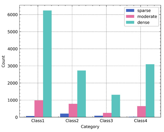 In Figure 9, the majority of events in category 2 are generated with dense traffic density, while the proportion of events with dense traffic density in categories 3 and 4 (higher speed) is relatively low in comparison to categories 1 and 2 (slower speed).