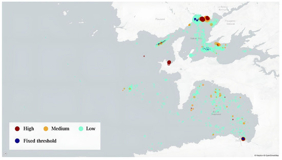In this dataset, the fixed-threshold approach identified far more events than the methods presented in this paper considered highly suspicious. The event visualization can be seen in Figure 10, the high, medium, and low suspicion results are shown in red, yellow, and sky blue colors, respectively, while the result of the fixed thresholds method is displayed in dark blue, with the bubble size representing the duration of the event.