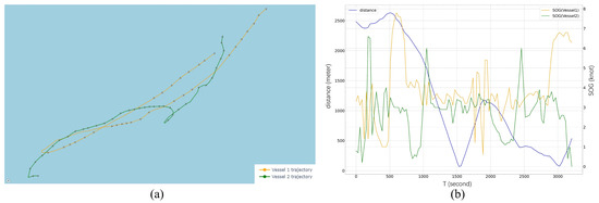 Figure 7a depicts the trajectory of the two vessels, and the arrow indicates the COG at that point. At the beginning of the event, Vessel1 and Vessel2 are far away and traveling in opposite directions, and following the first intersection, both vessels start to adjust their course until the two ships are once again close to each other, thereafter keep sailing in the same direction. Figure 7b illustrates the corresponding changes in velocity and proximity of the two trajectories in Figure 7a, showing that the two vessels intersected with the same trend of velocity change around the 1500 s, and that they intersected again around the 3000 s. Since the two vessels are under dynamic navigation, the duration of distance less than 100 m does not exceed 240 s. The fixed threshold method is not able to identify them during the whole period.