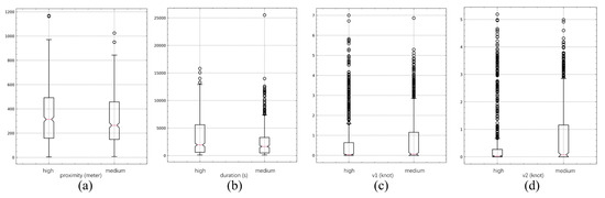 The high and medium-suspicious event features: (a) average proximity; (b) duration; (c) average speed of vessel 1; (d) average speed of vessel 2.