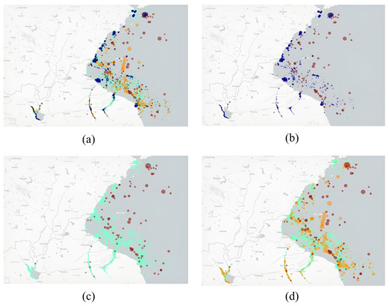 Visualization of suspected illegal transshipment identification results: (a) High/Medium/Low/Fixed threshold; (b) High/Fixed threshold; (c) High/Low; (d) High/Medium/Low (High-red bubble, Medium-yellow bubble, Low-sky blue bubble, Fixed threshold-dark blue bubble).