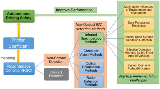In this paper, based on the mapping relationship between the friction coefficient and the RSC; the factors affecting the RSC were introduced; the four non-contact detection methods and the current status of research were summarised and analysed; and proposals were raised to solve the problems that exist in the future practical applications. It is expected to provide reference for the research on RSC detection for the rapid development of autonomous driving. Section 2 introduces the influencing factors affecting road surface friction coefficient and the principles of mainstream, non-contact RSC detection methods; Section 3 systematically describes the current research and application status of non-contact detection; Section 4 compares the four RSC detection methods and suggests solutions and feasible research directions for the problems of infrared spectroscopy in the direction of practical road-condition detection. Section 5 summarises the existing RSC detection techniques and provides an outlook. The structure of the article is shown in Figure 1
