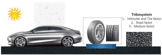 The RSC affects the relative friction coefficient between the vehicle and the road surface during driving. Conducted research for vehicle–road surface friction is divided into two categories: experiment-based [4] and model-based. The conducted research based on the experimental method aims to establish the correlation between the data collected from multiple experiments and the friction coefficient; the research based on the model method aims to generalise the corresponding mathematical model, and the common ones are based on the vehicular dynamics model and the tire [5] as base models [6]. The factors affecting the friction coefficient between the tire and the road surface can be summarised according to the following three aspects: the tire, road surface, the system environment, and the road–tire medium [7,8], as shown in Figure 2. Among them, the influence of tires on the friction coefficient is mainly reflected in the tire type, tread, inflation pressure, and tire temperature. The current vehicular tire friction model is more mature, with high accuracy and repeatability. The influence of the road surface friction coefficient is mainly determined by the road material and texture of the grain surface [9]. Different road materials, such as asphalt and cement, have large differences in skid resistance, and road aging and cracks also have a large impact on road friction coefficient and skid resistance. Huang et al. [10] at the College of Transportation, Southeast University, studied the safe braking of unmanned vehicles based on the road surface friction characteristics and proposed a safe braking strategy for unmanned vehicles combined with the road surface texture characteristics. The unmanned vehicular model was established based on simulations, and vehicle braking characteristics, such as straight-line braking and turning braking emergency braking were studied. These provided a reference for the vehicular braking system and safety braking evaluation.