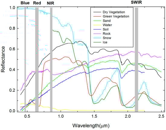 The infrared spectrum is a fingerprint of the material’s composition. Water, ice, and snow have different reflectances to infrared light. The reflectance differences can be used as a basis to distinguish different road states. For RSC detection, we are most concerned about the road surface media, such as water, and its different physical state changes (water, ice, snow) in addition to the road material [14]. Owing to the large differences in absorption coefficients of different substances, the use of infrared spectroscopy for RSC detection typically selects several characteristic wavelengths that are sensitive to water, ice, and snow, and uses their specific absorption characteristics as the basis for discrimination [15]. Figure 4 shows the spectral profiles of several typical land features (vegetation, sand, soil, water, and rock) extracted from the USGS(United States Geological Survey) spectral library in the visible to near-infrared (NIR) bands.