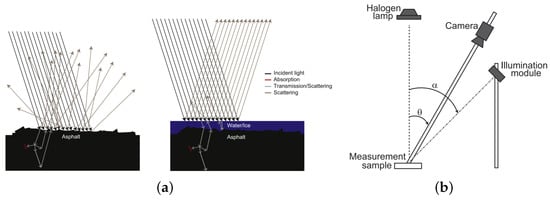 (a) Scattering of light incident on rough and smooth road surfaces. (b) Experimental setup with a halogen lamp (placed directly above the sample), a camera with an adjustable aperture lens, and an illumination module respectively mounted at angles equal to 30 and 45 degrees diagonally [17].