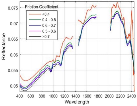 Carmon et al. [19] used a portable feature spectroradiometer (ASD) to identify road conditions by predicting the dynamic friction coefficient of asphalt in conjunction with the use of reflectance spectral data. The method used eight different spectral processing approaches to pre-process the data, which were: smoothing, MSC, SNV, absorbance, removal of continuous spectra, first-order derivative, second-order derivative, and final smoothing. The data from each pre-processing method were processed to create a data set. All data were modelled by using partial least squares and artificial neural networks (ANNs). After the data size was reduced with PCA, a system developed at the Remote Sensing Laboratory at the Tel Aviv University called ‘PARACUDA’ was used for fast automatic grouping and modelling. The final result achieved an accuracy equal to 0.845 between actual and predicted friction values (p < 0.0001). Figure 6 shows the average spectra of asphalt at different values of friction coefficients. Results show that the spectral characteristics of the asphalt road are influenced by the variation of the friction values.