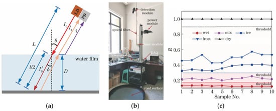 - Decao, W.; Peng, L.; Binbin, L.; Junhao, P.; Enhua, L.; Shanghai, J.; Bin, T.; Tao, S. Methods for Non-Contact Road Surface Meteorological Sensing Based on Dual-Wavelength Laser. Acta Opt. Sin. 2020, 40, 117–123. (In Chinese) [Google Scholar] [CrossRef]