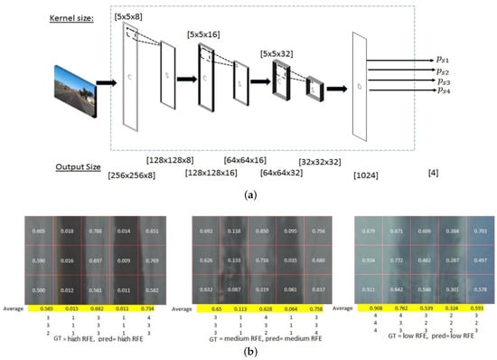 Roychowdhury et al. [37] estimation of real-time road friction coefficients by using machine learning. They proposed a two-stage approach for estimating RSC by indirect reflectance based on the use of forward-looking camera images captured from vehicles. In phase 1, a convolutional neural network model architecture was implemented to learn region-specific features for RSC classification. The discovery of texture-based features from the driving surface, the sky, and the surrounding environment were determined to be independent regions for RSC classification, such as dry, wet, snow, mud, and ice. In phase 2, the driveable surface of the lane was segmented into [5 × 3] blocks by its established model, and the segmented blocks were classified and quantified to separate the image reflectance with high, medium, and low reflectance. Part of the results are shown in Figure 11b below. The proposed method achieves an average accuracy of 97% in the first and second stages of RSC classifications.