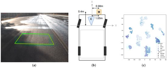 Kai Cordes dataset collection process. (a) Schematic representation of the area from which the data set was collected. (b) Location of the detection equipment mounted on the vehicle. The orange square Marwis is located at the bottom right of the vehicle, and the blue cone C shows the camera mounted at a fixed height above the car; (c) Visualisation and analysis of the RoadSaW dataset based on the use of t-SNE. The three surfaces, namely, asphalt, cobble, and concrete, are indicated by different markers. The four subcategories, namely, dry, wet, wet, and very wet, are shown with four shades of blue [43].