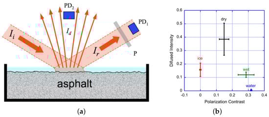 Colace et al. [49] used an indium gallium arsenide (InGaAs) infrared detector to measure diffuse, reflected light subjected to near-infrared illumination, and extracted the contrast after polarised light reflection. Several tests were conducted on various types and thicknesses of asphalt. The conclusions showed that the system could identify dry, water-layered, wet, and asphalt with ice, and demonstrated that the system was robust. The setup is shown in Figure 13a. PD1 and PD2 are InGaAs photodiodes, and P is the analyser. Two InGaAs photodiodes measure the intensity of the two polarisation components of reflected light (via PD1 and the analyser) and diffuse light (via PD2) respectively. The resulting surface polarisation contrast constitutes reliable data for identifying normal, ice, and wet/water conditions, but it needs data from diffuse light to distinguish between wet and water-covered roads. Figure 13b below shows some of its experimental results, which are the diffuse reflected intensity and polarisation contrast.