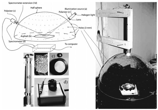 Diagram of the experimental setup of Casselgren. Left top is a sketch over the measuring procedure. Right is the experimental setup. A hemispherical Plexiglass hood was used. Holes were punched at 10-degree intervals in the longitude and latitude directions of the hood with a diameter of 3 mm, and the hood was placed over the road asphalt sample (left bottom (b)). A polariser (left bottom (c)) was placed in front of the light source (left bottom (a)). The spectrometer with the extension (left bottom (d)), and the direction of polarisation was adjusted both horizontally and vertically [53].