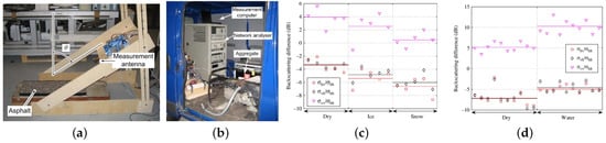 (a) Detection device. Horn antenna mounted on the rotating arm points to the asphalt placed on the floor and is used for detection. (b) Placement of the detection device on the truck. (c) Markers indicate individual measurements, and solid lines indicate the average of the corresponding RSC and polarisation values showing the backscatter ratios for different polarisations; the graphs show the backscatter versus polarisation normalisation in different polarisations for dry, ice, and snow asphalt road. (d) Backscatter versus polarisation normalised backscatter for dry and wet asphalt at different polarisations [57].