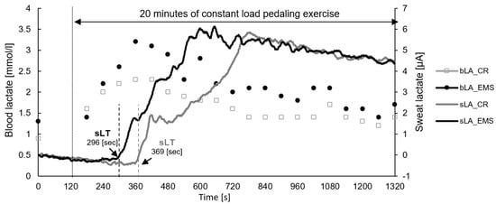 Representative data of sweat lactate and blood lactate concentrations during constant load pedaling exercise. EMS, electrical muscle stimulation; CR, without EMS stimulation; bLA, blood lactate; sLA, sweat lactate; sLT, sweat lactate threshold.