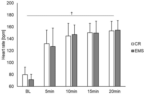Comparison of the heart rate between the EMS and CR conditions (n = 15). †: p < 0.01 significant main effect at time point. EMS, electrical muscle stimulation; CR, without EMS stimulation.