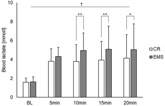 Comparison of blood lactate concentrations between the EMS and CR conditions (n = 15). †: p < 0.01 significant main effect at time point. * p < 0.05, ** p < 0.01 significant difference between conditions. EMS, electrical muscle stimulation; CR, without EMS stimulation.