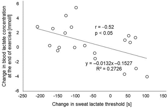 Relationship between the change in blood lactate concentration at the end of exercise and the change in sweat lactate threshold (n = 20). The amount of change is calculated as the value of the EMS condition minus the value of the CR condition. EMS, electrical muscle stimulation; CR, without EMS stimulation.