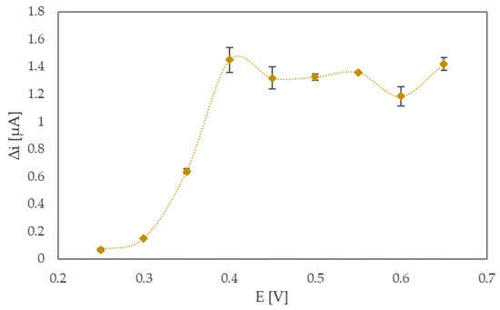 Sensor response towards 0.2 mM glucose in 0.1 M phosphate buffer (pH 7.4) measured at different operating potentials. The line was smoothed with Microsoft Excel.