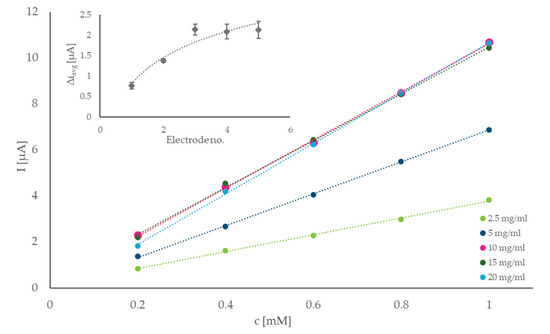 To further optimize the response of the sensor and ensure that the maximum sensitivity was achieved with the proposed setup, the GOX concentration on the electrode surface was evaluated. Solutions with different concentrations of GOX were prepared, and 5 µL of each were cast onto the electrodes, already modified with N-htGONR/MnO2 composite. Five different concentrations were tested: 2.5, 5.0, 10, 15, and 20 mg/mL GOX. The sensitivities of electrodes with different GOX amounts on their surfaces were evaluated by measuring the response of the electrodes to five consecutive additions of 0.2 mM glucose solution, respectively. Current responses were calculated from the amperograms and plotted as function of glucose concentration, as seen in Figure 3. The sensitivity was determined as the trendline slope. The insert of Figure 3 shows average current response for the same set of measurements, per electrode. Both graphs in Figure 3 suggest that the current response was significantly increased with GOX concentration for the electrodes prepared with 2.5, 5.0, and 10 mg/mL GOX, and that there is not much difference between the responses of electrodes with 10, 15, and 20 mg/mL GOX on their surface. Since every electrode is thoroughly rinsed with MQ after its modification and before use, a simple deduction suggests that around 10 mg/mL GOX, which represents most of the possible immobilization sites on the electrode, are already occupied, and the increase in the concentration of the enzyme will not contribute significantly to the sensitivity of the sensor. Additionally, the enzymes are generally expensive, therefore lower consumption of GOX is desired. Considering all the data and reagent consumption, 10 mg/mL was chosen as the optimal concentration of GOX.