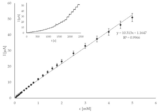Calibration curve obtained by adding six times 0.05 mM, five times 0.1 mM, six times 0.2 mM, and six times 0.5 mM aliquots of glucose standard solutions prepared in 0.1 M phosphate buffer solution, with pH 7.4, at operating potential 0.4 V. The insert shows the amperogram of the same measurement.