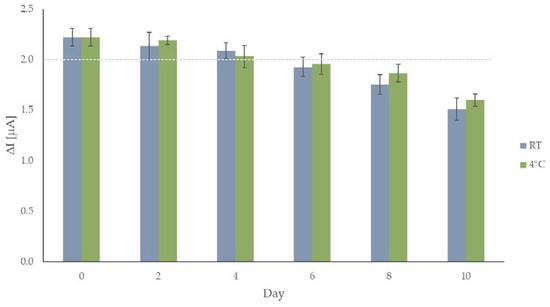 Other important aspects that need to be considered in sensor fabrication are its lifetime and the reproducibility of the electrode surface preparation. The lifetime was studied on two sets consisting of six electrodes: the first set was kept in the dark at room temperature (RT), the second was kept in the refrigerator at 4 °C. Average responses of the sensors kept at room temperature, and in the refrigerator after 2, 4, 6, 8, and 10 days since their preparation, are shown in Figure 5, respectively. Over 90% of the response (note the dashed line in Figure 5) is definitely retained after four days in case of both sets of the electrodes, and considering the error bars, both sets of electrodes can be used for up to six days. Amperograms for both sets of electrodes after day 10 are shown in Figure S4. Since this is an enzymatic sensor, these results are acceptable and confirm the fact that GOX is a suitable enzyme for this application.