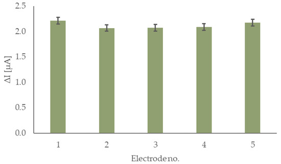 Similar to lifetime studies, the reproducibility of the sensor preparation was also investigated, and the results are shown in Figure 6. Five electrodes, prepared on different days using the same modification approach, were tested. Their response to 0.2 mM glucose in 0.1 M phosphate buffer (pH 7.4) was measured. Five consecutive additions of 0.2 mM glucose were performed for each electrode. The calculated relative standard deviation (RSD) value for the response is 3.3%, which confirms the robustness of this sensor fabrication approach. Considering all the collected data presented in this chapter, it was decided that the sensor is ready to be tested against common interferences and in a real matrix.